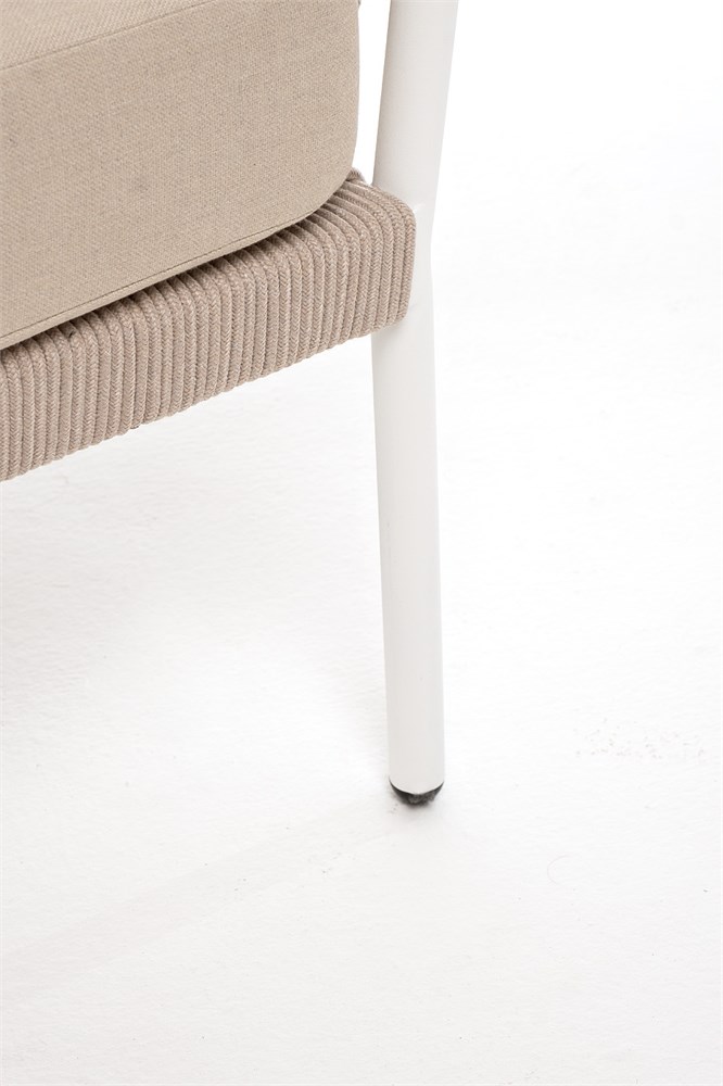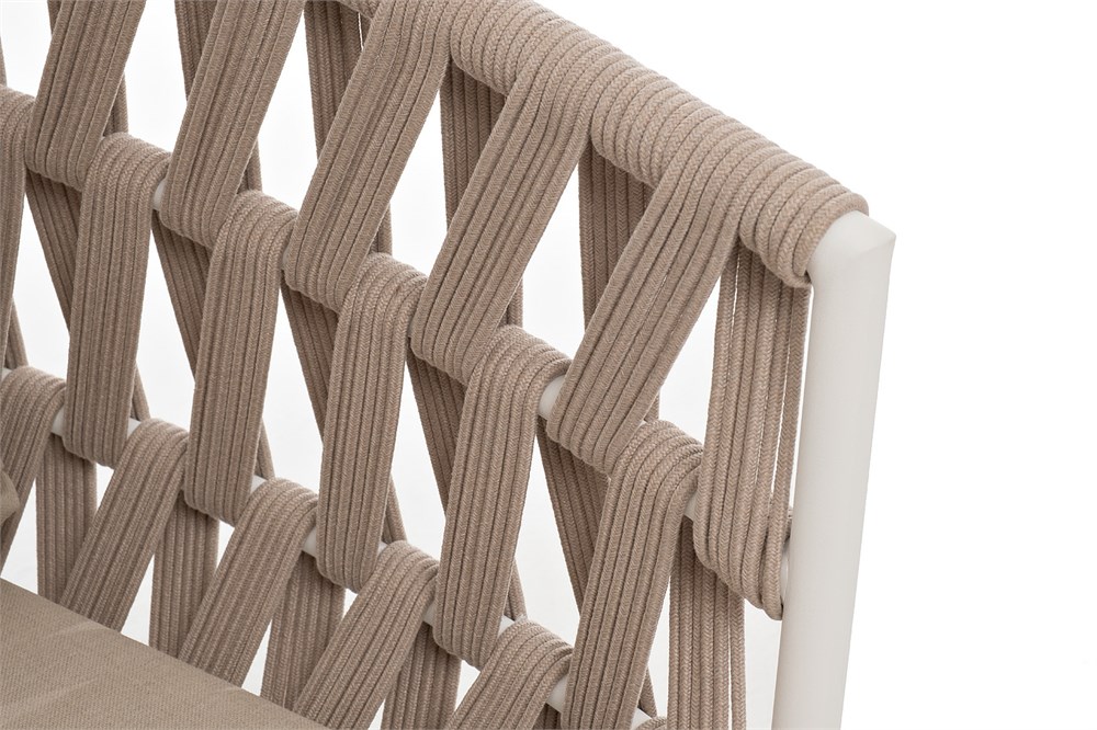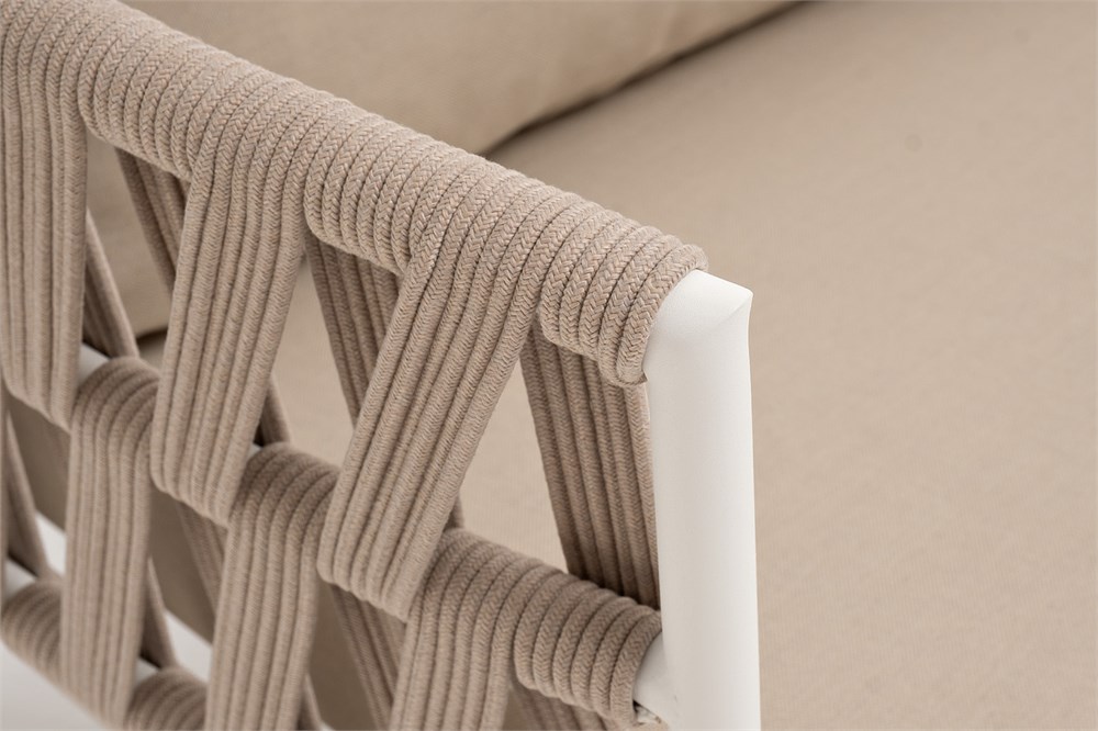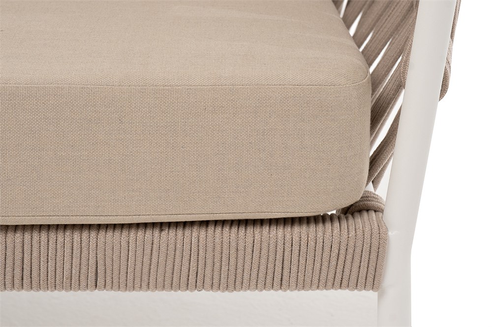 Двухместный диван «Диего» с подушками в комплекте. Диван имеет алюминиевый каркас, окрашенный порошковой краской в белый цвет. Боковины каркаса и спинка вручную оплетены роупом — эластичными синтетическими лентами, изготовленными из высокопрочных полиэфирных волокон. Цвет оплетки — бежевый. Подушки состоят из наполнителя и съёмных чехлов, которые обработаны влагоотталкивающей пропиткой бежевого цвета. Материал — 100% полиэстер, плотностью 300гр/м2. Размер плетеного дивана: 1580×720×770 мм.