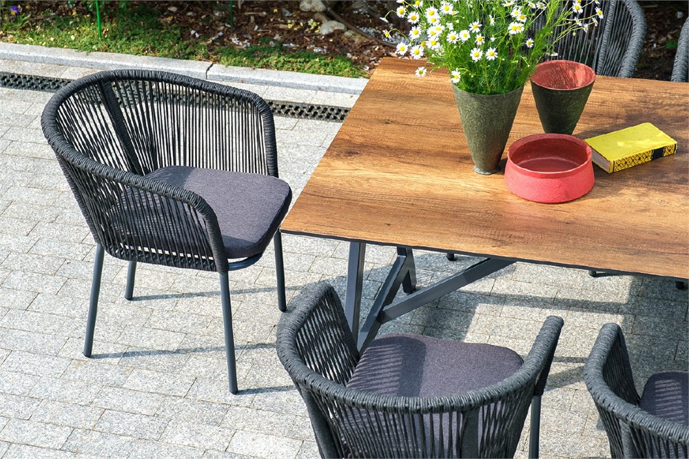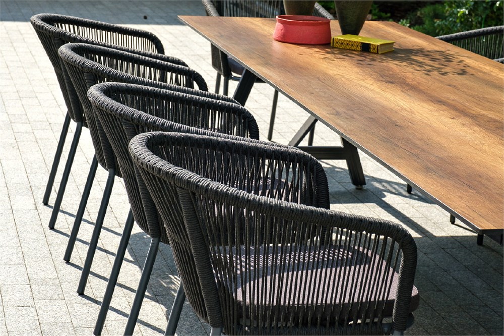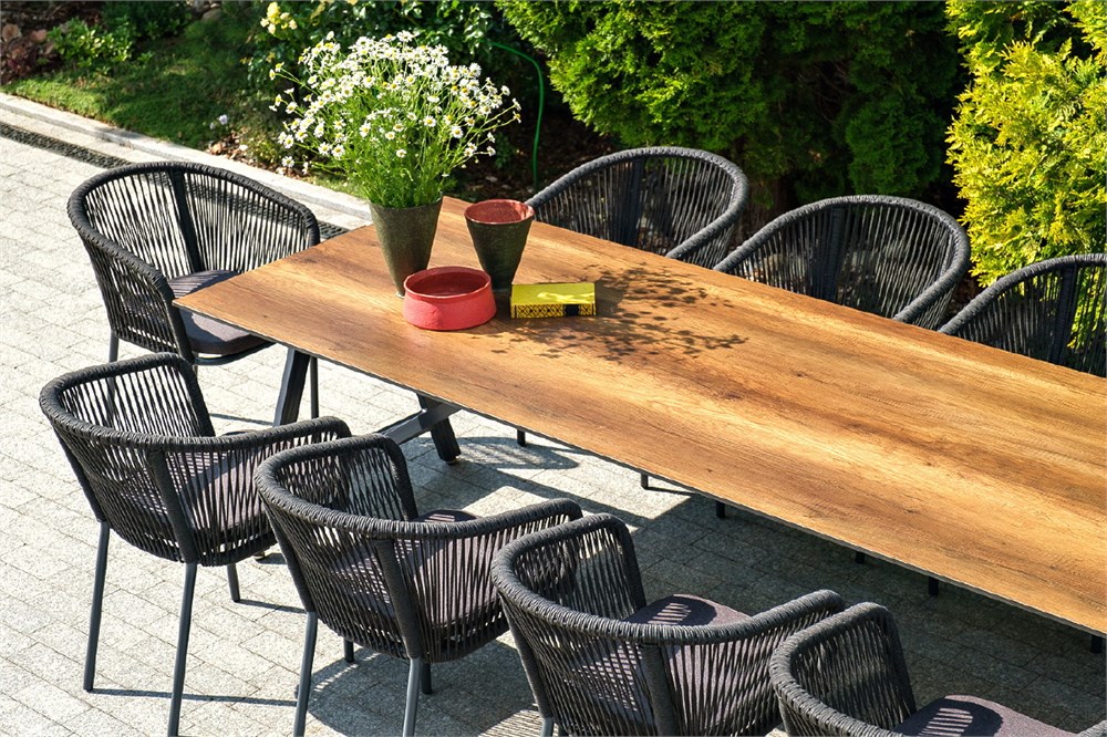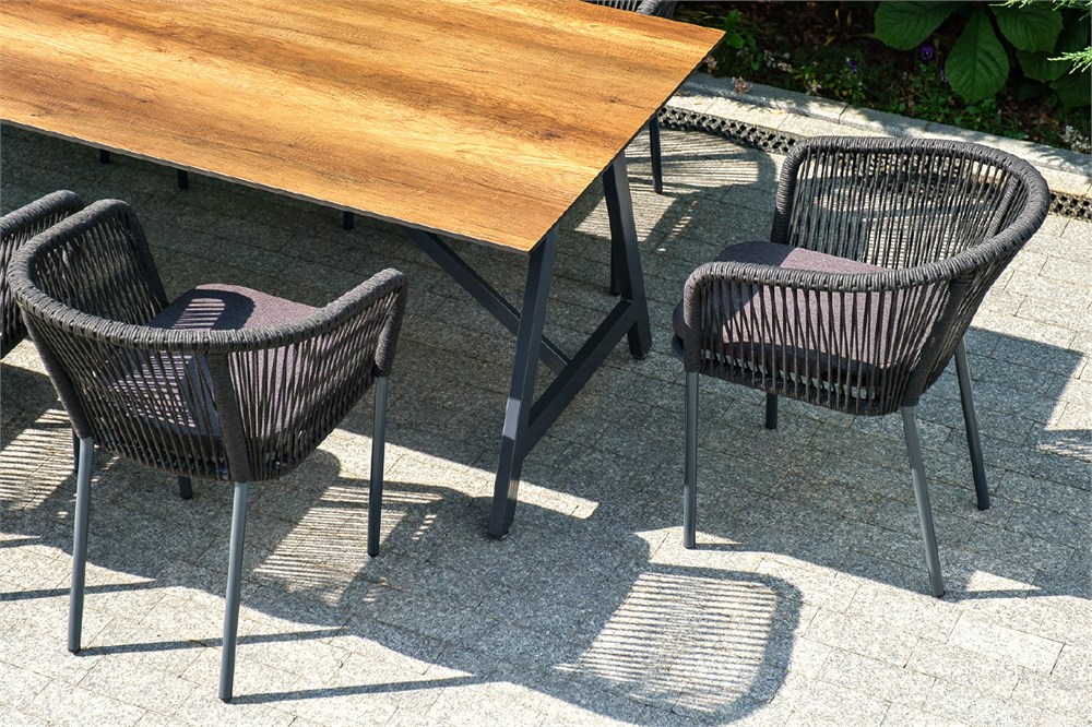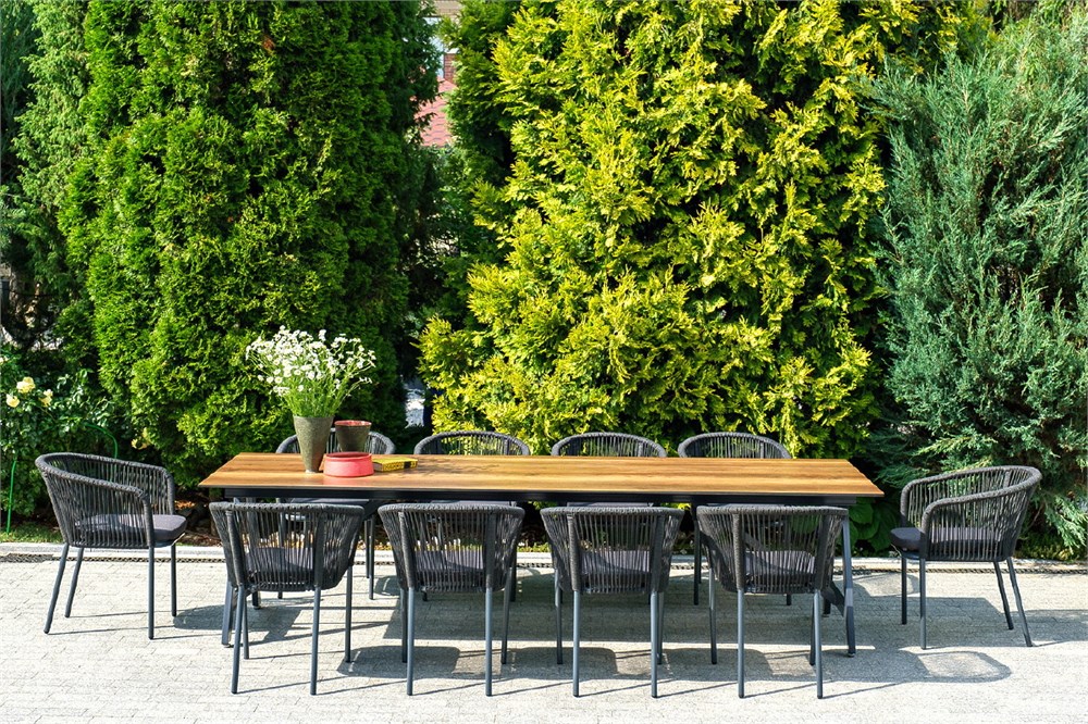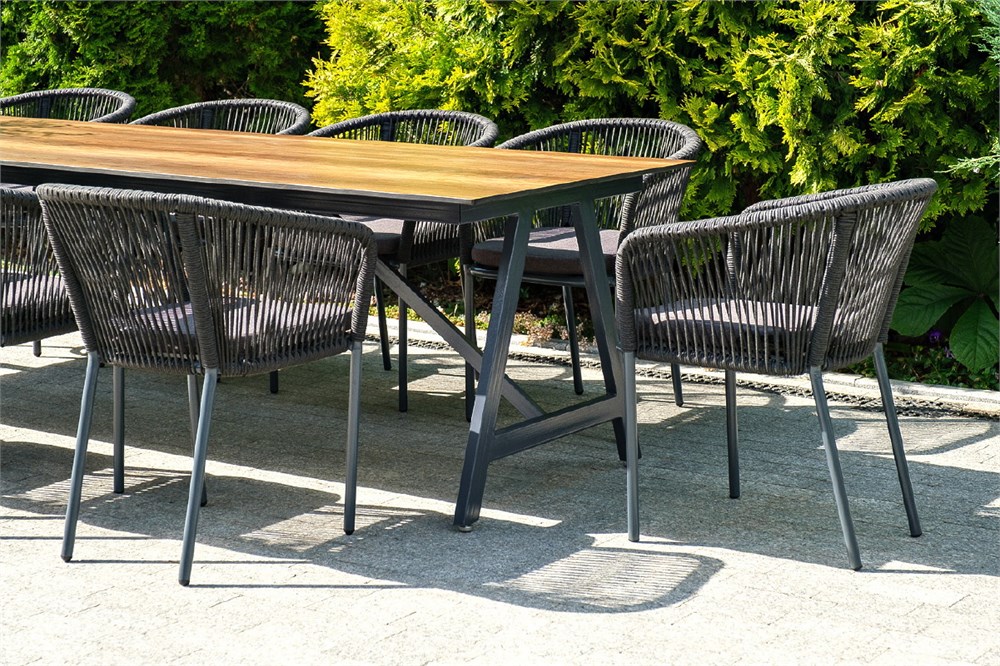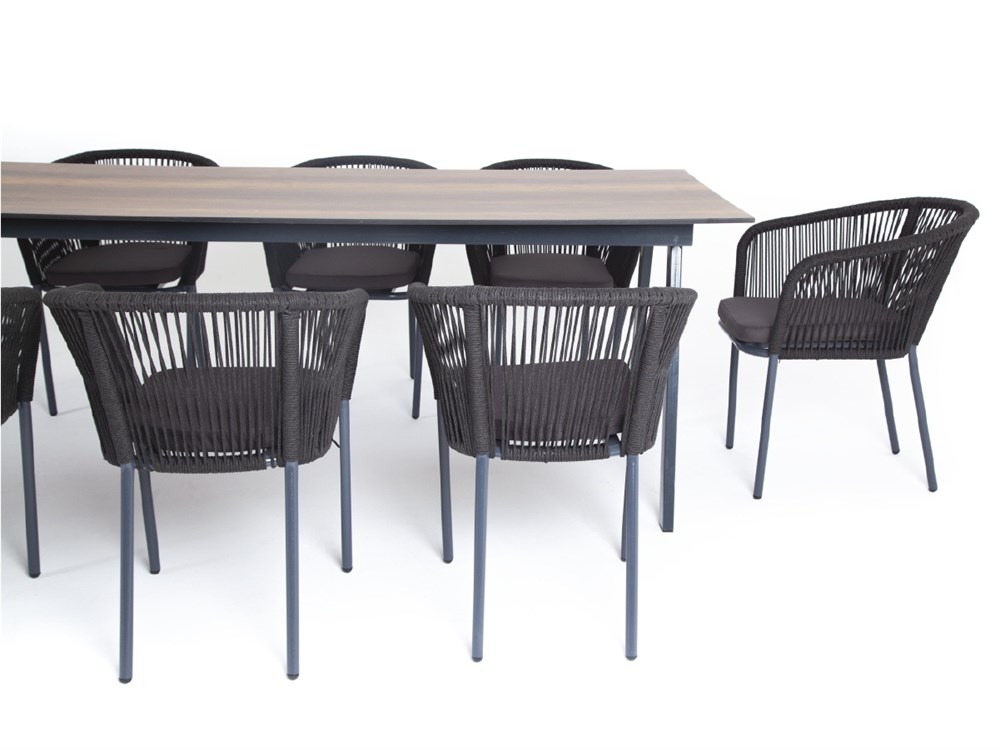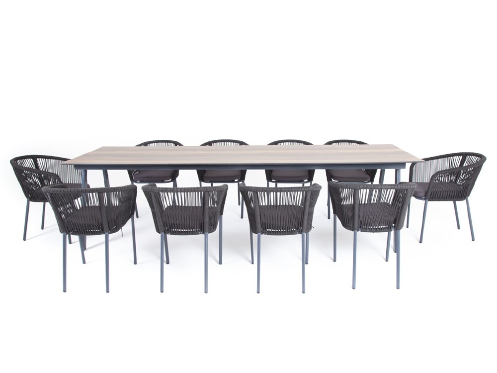 Обеденная группа «Куба» рассчитана на 10 персон. В состав комплекта входит: — Стол обеденный 300х100 см, цвет «дуб». — 10 плетеных стульев «Марсель» из круглых эластичных лент, размером — 570х620х775 мм, цвет темно-серый.