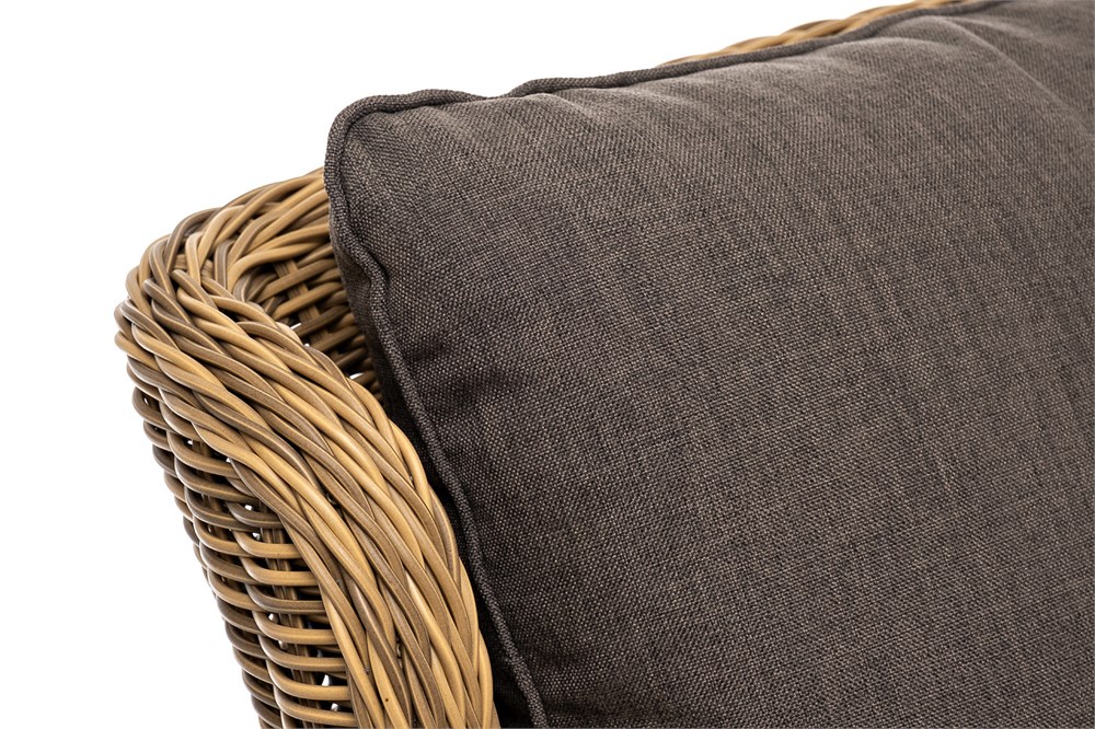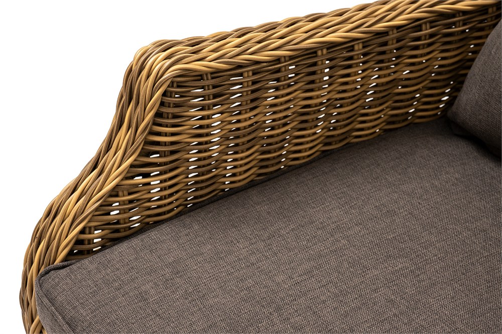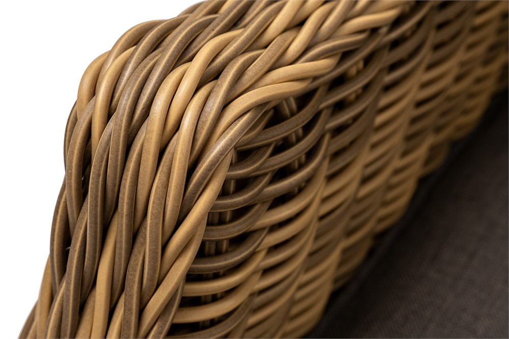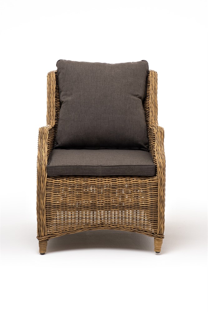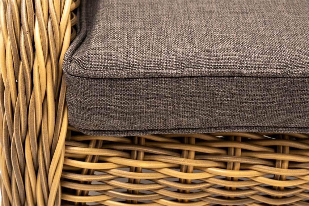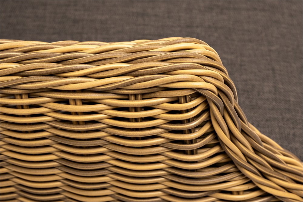 Стул «Неаполь» имеет практичные подлокотники для удобного размещения во время отдыха. Спинка и подлокотники имеют планые линии, благодаря своим закругленным формам. Каркас мебели сделан из алюминия. Присутствует ручное круглое плетение, при изготовлении которого используется искусственный ротанг. Представлено в соломенном цвете. Плетенный стул дополняют мягкие подушки. Они выполнены в серо-коричневом оттенке. Пошиты изделия из плотного полиэстера 230гр/м2. Ткань предварительно обрабатывается влагоотталкивающей пропиткой. Размер модели – 650×900×920 мм.