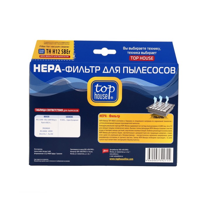 Отличительной особенностью фильтра Top House TH H12SBEr является простота его установки. Представленный фильтр незаменим, если в Вашем доме проживают люди, у которых имеется аллергия на пыль. Фильтр имеет уникальную конструкцию. Он выполнен из двух инновационных и прочных материалов. Фильтрация воздуха осуществляется посредством прослойки из микроволокна, которая прикреплена к каркасу из пластика. Фильтр спроектирован инженерами компании Top House специально для пылесосов марок Bosch и Siemens.