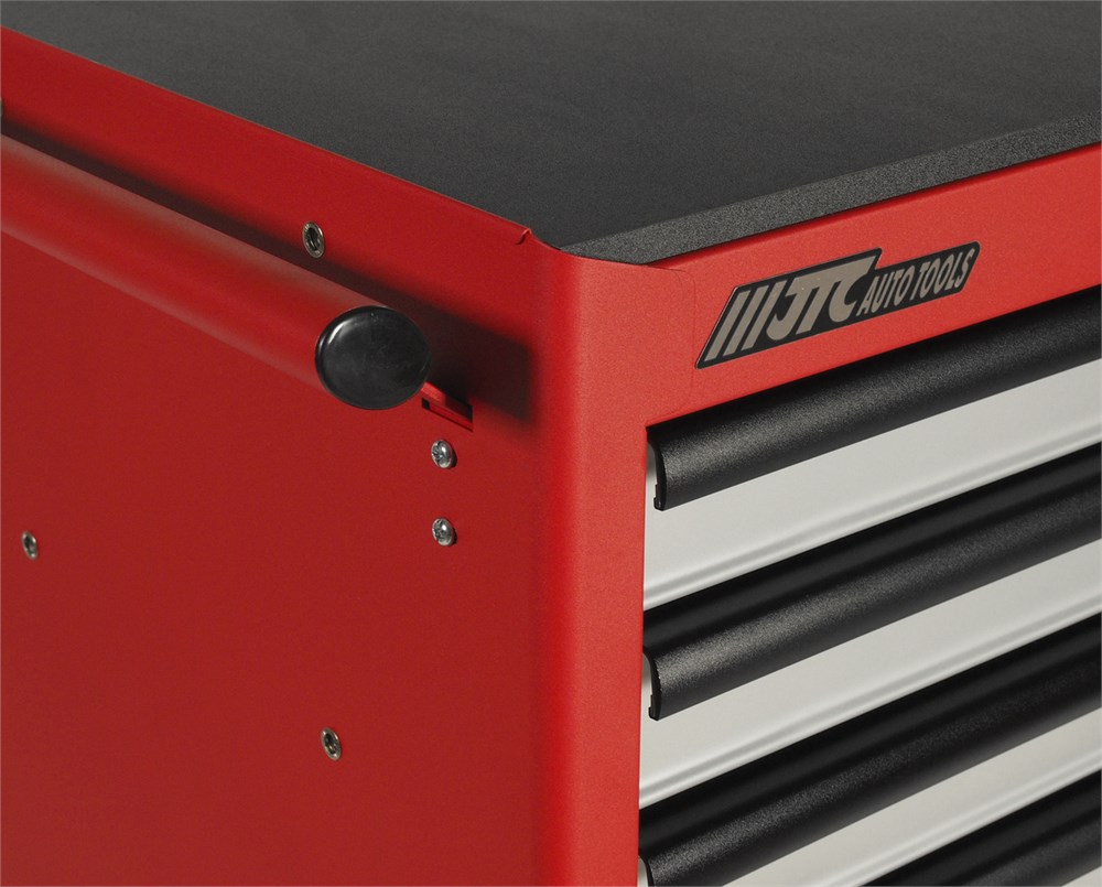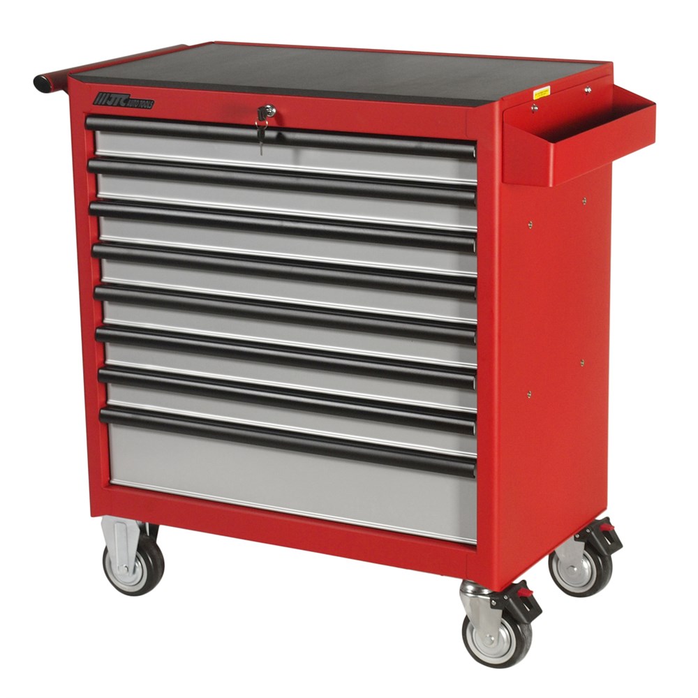 JTC-5641 — Тележка инструментальная 8 секций (JTC-5641) 861х1000х498мм JTC — Тележка состоит из 8 секций. Размеры ящиков подходят для всех наборов инструментов JTC K-серии. Ящики оснащены фиксирующими защелками, которые предотвращают случайное откр