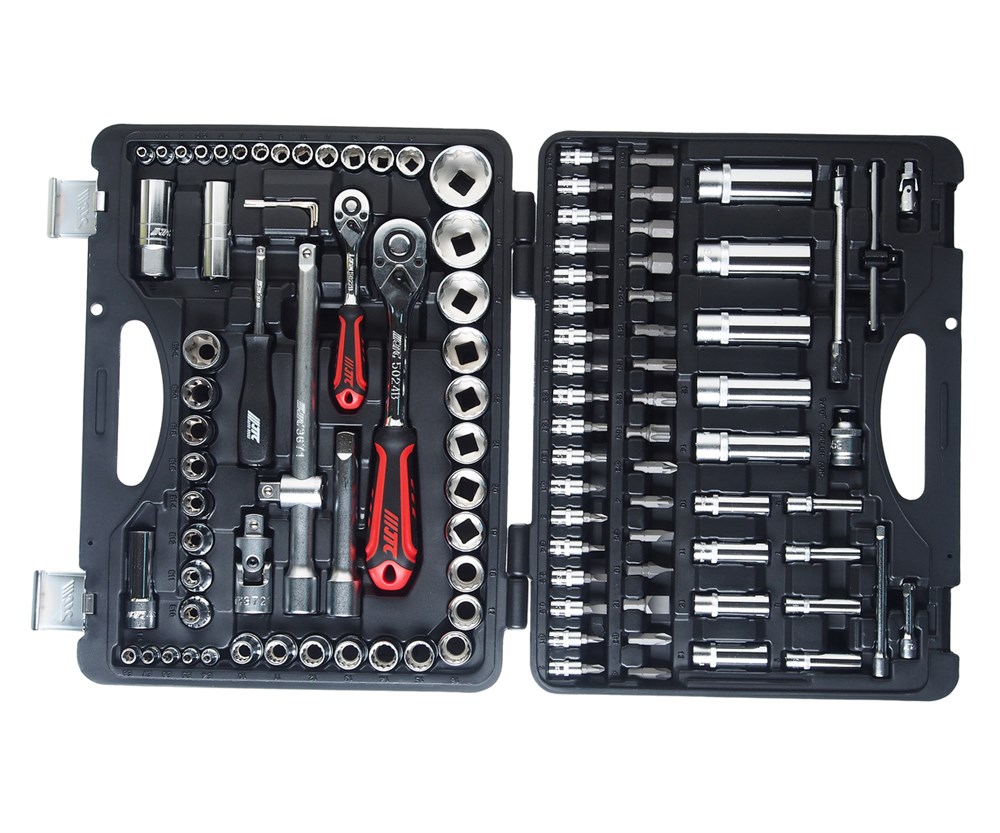 Комплектация 1/4″: Головка торцевая, 12 граней 1/4″ (4, 5, 5.5, 6, 7, 8, 9, 10, 11, 12, 13, 14 мм); Головка торцевая длинная, 12 граней 1/4″ ( 6, 7, 8, 9, 10, 11, 12, 13 мм); Головка торцевая 1/4″ (Е4, Е5,Е 6, Е7, Е8 мм); Головка с насадкой HEX 1/4″ (3, 4, 5, 6 мм); Головка с насадкой TORX 1/4″ (T8, T10, T15, T20, T25, T27, T30); Головка с шлицевой насадкой 1/4″ (4, 5.5, 6.5 мм); Головка с насадкой PH 1/4″ (PH1, PH2); Насадка PZ 1/4″ (PZ1, PZ2); Трещотка (силовая) 1/4″, 72 зуба (резиновая ручка); Удлинитель 1/4″ 50 мм; Удлинитель 1/4″ 100 мм; Удлинитель гибкий 150 мм; Вороток 1/4″ с плавающей головкой 115 мм; Кардан 1/4″; Вороток-отвертка 1/4″ 150 мм; Короткие шестигранники (1.5, 2, 2.5). Комплектация 1/2″: Головка торцевая, 12 граней, 1/2″ (10-22, 24, 27, 30, 32 мм); Головка торцевая длинная, 12 граней, 1/2″ (14, 15, 17, 19, 22 мм); Головка торцевая 1/2″ (Е10, Е11, Е12, Е14, Е16, Е18, Е20, Е24); Насадка 5/16″ HEX (7, 8, 10, 12, 14 мм); Насадка 5/16″ TORX (T40, T45, T50, T55, T60); Насадка 5/16″ PH для ударной отвертки (PH3, PH4); Насадка 5/16″ PZ для ударной отвертки (PZ3, PZ4); Насадка 5/16″ 30 мм. шлиц (8, 10, 12 мм); Трещотка 1/2″ силовая (резиновая ручка), 72 зуба; Удлинитель 1/2″ 125 мм; Удлинитель 1/2″ 250 мм.