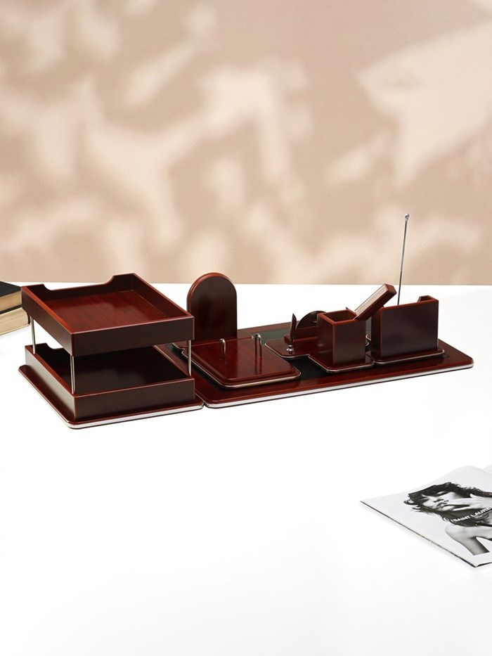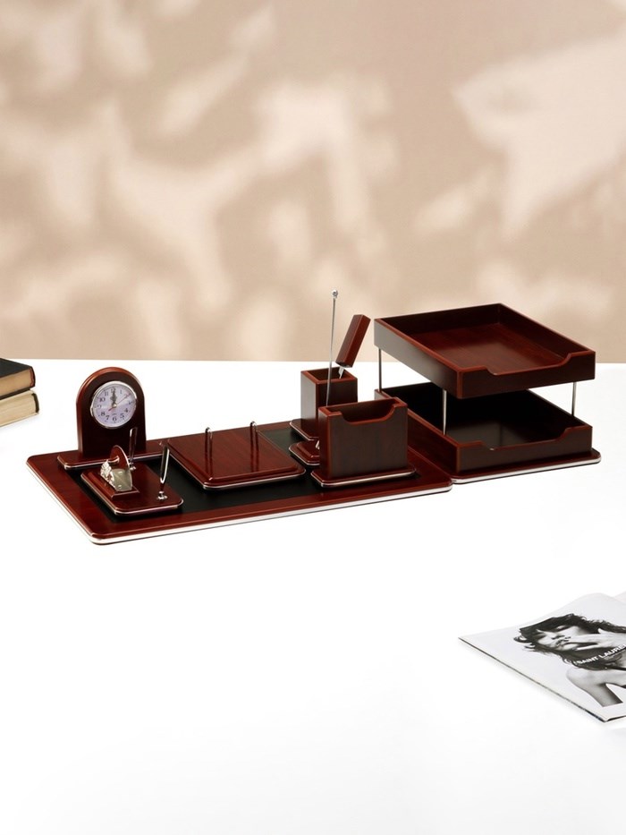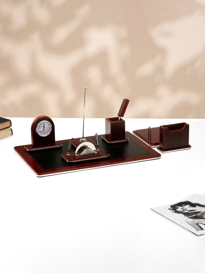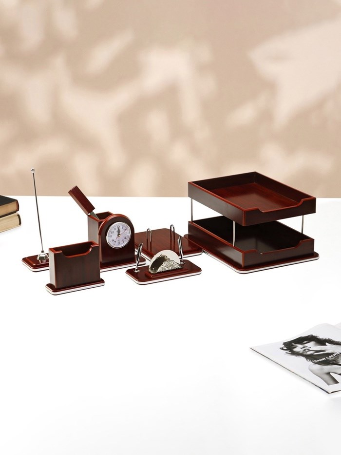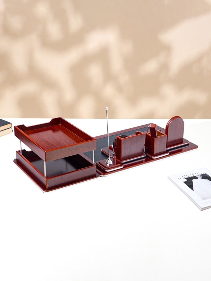 Компактный настольный набор поможет избежать хаоса на рабочем месте. Храните в нём канцелярские принадлежности или другие мелочи, чтобы правильно организовать пространство. К тому же изделие имеет минималистичный дизайн и выполнено под дерево, поэтому оно украсит собой любое место как декоративный элемент.