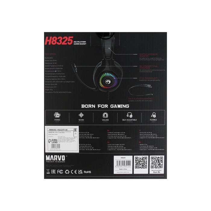 Наушники Marvo H8325, игровые, полноразмерные, микрофон, USB + 3,5 мм, 2 м, RGB, чёрные