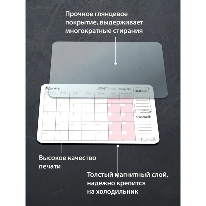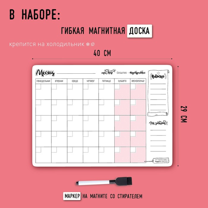 Планер представляет собой мягкое магнитное поле, которое крепится на холодильник или магнитную доску, в набор входит стираемый маркер.