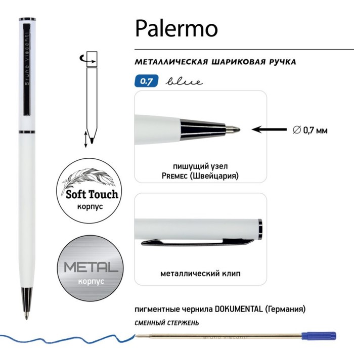 Покрытие корпуса Soft Touch гарантирует дополнительный комфорт в работе с ней. Стержень легко выдвигается благодаря поворотному механизму. Синие пигментные чернила DOKUMENTAL (Германия) и пишущий узел Premec (Швейцария) – обеспечивают качественное и мягкое письмо.