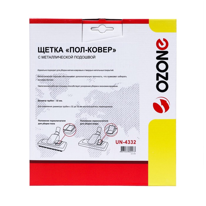 Щетка для пылесоса «Пол-ковер» Ozone с металлической подошвой — это универсальный аксессуар, который позволяет эффективно очищать как твердые, так и ковровые покрытия. Она имеет ширину 270 мм и длину 100 мм, что обеспечивает большую площадь уборки за один проход.