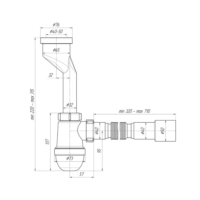 Сифон предназначен для писсуара бутылочного типа. Для подключения к канализации комплектуется гибкой трубой размером 40 × 40/50 мм. Также есть универсальная присоединительная манжета, которая позволяет осуществить установку на все существующие литые выпуски писсуаров.