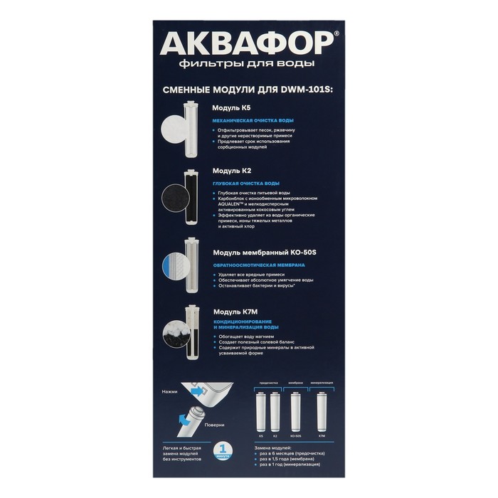 Обновляйте модуль предочистки раз в 6 месяцев и мембрану раз в 1,5 года.